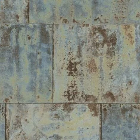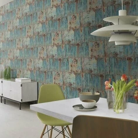 Bring a modern feel to your living space with this amazing metal effect wallpaper from Rasch. This design features a stunning industrial style rusted metal effect print in teal and green tones throughout, finished on a textured vinyl for a truly mesmerising wallcovering.