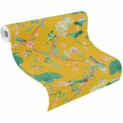 RASCH Oriental Wallpaper Chinese Garden Textured Heavy Duty Vinyl Feature Wall Yellow