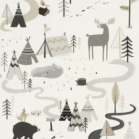 Design: Bear, Forest, Moose, Teepee. Design Repeat: 53cm. Easy Application, Offset Pattern Match, Paste the Paper. Finish: Textured.
