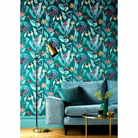 Introduce some glamour to your living space with this gorgeous Metallized Floral wallpaper from Rasch collection. This design features a stunning tropical print in Blue and Pink with Teal metallic textured detail throughout, finished on a textured vinyl background for a truly mesmerising wallpaper.