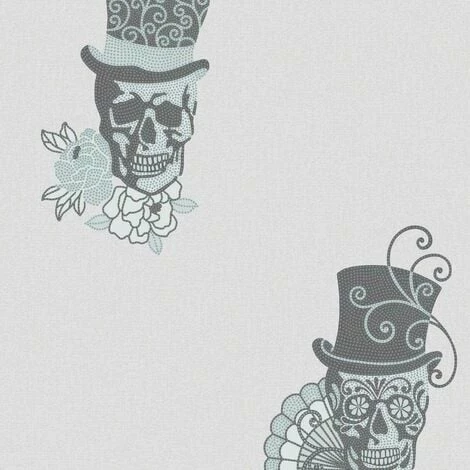 Rasch Sugar Skull Wallpaper 308921A metallic silver background with silver teal glitter dot skull motifs throughoutPerfect for a feature wallPaste the paperStraight matchPattern repeat: 64cmPeelableWashableGood lightfastnessRoll size: 10m x 0.53mCoverage per roll: 5.32sqm approxAll rolls ordered together will be the same batch number