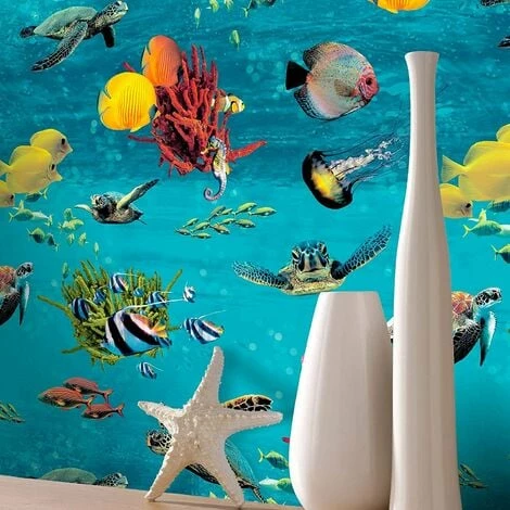 This beautiful Sea Life Wallpaper will add a splash of colour to your home. The fun design features an underwater theme with an array of colourful sea creatures including tropical fish, turtles, jellyfish and coral in vibrant jewel like tones. This is set on a shimmering sea blue background with a subtle sheen and a lightly textured finish. This high quality wallpaper would look great when used to create a feature wall or to decorate an entire room. Additional Product Information: Pattern Repeat: 53cm Pattern Match: Straight Match Wallpaper Type: Paper Wallpaper Finish: Flat Durability: Washable Roll Length: 10m Roll Width: 53cm Roll Coverage is 5.3 Square Metres Application: Paste the Paper