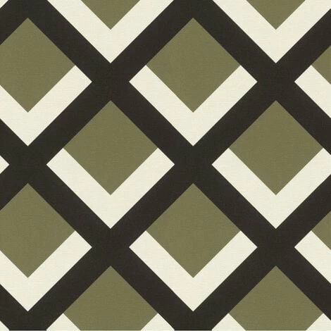This wonderful design presents itself with corners and edges in retro style. With a wide black grid, green and khaki diamonds are presented on a creamy white background with a 3D effect. This wallpaper fleece is straight, but individual and expressive, perfect for your home!