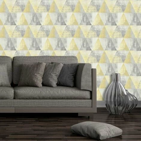 A stunning wallpaper inspired by geometric designs with a modern twist. Pastel yellow and grey colour scheme with a bold design. Perfect for use on a large wall area and makes a fabulous feature wall. A great choice for a hallway or living area.